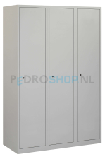 De garderobekast is een robuuste en betrouwbare oplossing voor het netjes opbergen van kleding en persoonlijke eigendommen. De kast heeft drie afzonderlijke kolommen, elk uitgerust met een legbord en een kledingstang met haken. Dankzij de volledig gelaste staalconstructie en krasvaste epoxy poedercoating is deze kast uitstekend geschikt voor intensief gebruik in kleedruimtes, bedrijven, sportaccommodaties en scholen.