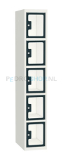 De SQ Classic Lockerkast 5-deurs met transparante deuren. De lockerkasten zijn naar eigen wens samen te stellen. Opties uit verschillende kleuren deuren en ombouw. Deze lockerkast kent voor de deuren de kleurcode: Antraciet Ral 7016 en voor de ombouw: Wit Ral 9010.