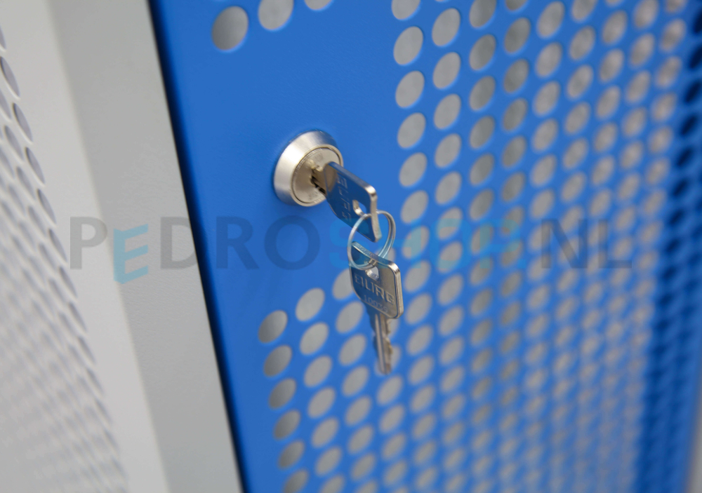 De kast wordt standaard geleverd met een cilinderslot inclusief twee sleutels. De binnenliggende scharnieren maken het mogelijk de deuren tot 90 graden te openen. Onder het legbord bevinden zich twee stevige kunststof kledinghaken voor het netjes ophangen van jassen, tassen of andere items.