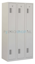 Deze garderobekast is een degelijke en praktische kast met drie kolommen en drie deuren, ideaal voor het veilig opbergen van kleding en persoonlijke eigendommen. De kast heeft een stevig gelaste staalconstructie en is afgewerkt met een duurzame, krasvaste epoxy poedercoating.