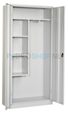 De bezem, dweil, stofzuiger en overige schoonmaakmiddelen netjes opruimen achter slot? Zet hiervoor de PDC schoonmaakkast in. De PDC-195 bezem- schoonmaakkast is een stevige stalen kast welke beschikt over hanghaken voor opbergen van bezems en dweilen. Over de totale breedte van de kast treft u een legbord. Het linker gedeelte van de kast is voorzien van drie legborden. Doordat er een vrije ruimte is onder het onderste legbord, is er voldoende ruimte voor het opbergen van een stofzuiger en/of emmers. Het rechter gedeelte van de kast kent een kledingroede met verschuifbare haken.
