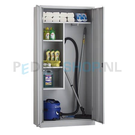 De bezem, dweil, stofzuiger en overige schoonmaakmiddelen netjes opruimen achter slot? Zet hiervoor de PDC schoonmaakkast in. De PDC-195 bezem- schoonmaakkast is een stevige stalen kast welke beschikt over hanghaken voor opbergen van bezems en dweilen. Over de totale breedte van de kast treft u een legbord. Het linker gedeelte van de kast is voorzien van drie legborden. Doordat er een vrije ruimte is onder het onderste legbord, is er voldoende ruimte voor het opbergen van een stofzuiger en/of emmers. Het rechter gedeelte van de kast kent een kledingroede met verschuifbare haken.
