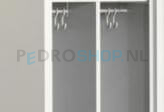 De garderobekast heeft een stevige gelaste staalconstructie en is afgewerkt met een duurzame krasvaste epoxy poedercoating. De geperforeerde deuren zijn rechtsdraaiend en uitgevoerd met een RVS veerscharnier, waardoor ze tot 110 graden geopend kunnen worden. Stootdoppen aan de binnenzijde zorgen voor een zachte en gedempte sluiting, terwijl een omegaprofiel extra stevigheid biedt. Ook de achterwand is geperforeerd voor natuurlijke ventilatie. Aan de zijkanten bevinden zich koppelgaten waarmee de kast eenvoudig zijdelings kan worden gekoppeld aan andere PDC-kasten.