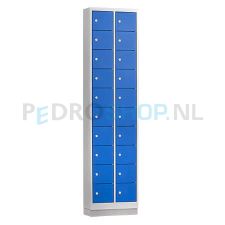Deze PDC mini lockerkast kent 2 kolommen waarvan iedere kolom is voorzien van 10 deuren. Dit betekent een totaal aantal deuren van 20. De vakken zijn er echt op gericht om enkel persoonlijke eigendommen op te bergen. Tassen en/of jassen gaan niet in deze mini lockerkast passen. De netto doorsteekmaatvoering per lockerdeur is: hoogte 15,1 bij breedte 16,5 en diepte 16,2 cm. Wenst u uw personeel of bezoekers de mogelijkheid te bieden ook jassen en/of tassen op te bergen? Dan raden wij u een standaard lockerkast aan. Te vinden onder bijvoorbeeld lockerkasten – metalen deuren.