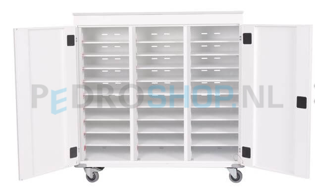 Deze SQ laptop trolley is geschikt voor de opberging van 30 laptops (3 rijen van 10 vakken naast elkaar). Tevens is de ruimte te gebruiken voor tablets of smartphones. De laptop trolley is voorzien van stroomvoorziening voor alle laptops (ieder vak is voorzien van een stroompunt).