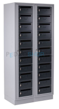 Deze postvakkenkast biedt ruimte voor het opbergen van poststukken en enkele eigendommen. De postvakkenkast kent 2 kolommen, elke kolom is voorzien van 11 postvakken (in totaal 22 postvakken). Deze postvakkenkast kent voor de deuren de kleurcode: Antraciet Ral 7016 en voor de ombouw: Lichtgrijs Ral 7035.
