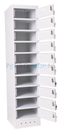 De laptopkast beschikt over een slot voor elk vak. Elk vak beschikt standaard over een cilinderslot (met 2 sleutels per slot). Ook is er de mogelijkheid om de vakken te voorzien van valgrendelsloten. Op aanvraag kunnen er ook mechanische cijfersloten of elektronische pincode sloten gemonteerd worden op de vakken. Let wel op dat bepaalde sloten een levertijd kennen, dit kan op aanvraag besproken worden.