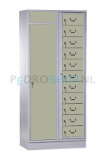 De SQ combinatie kledingdistributie- wasopvangkast met 11 deuren. Deze kast is een slimme combinatie van twee functies in één compacte behuizing. Links een apart vak voor het verzamelen van vuile was, rechts een kledinguitgiftesysteem met 11 individuele vakken. Praktisch, hygiënisch en ruimtebesparend.