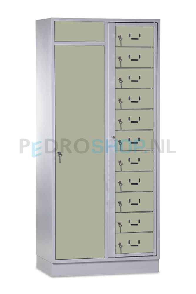 De SQ combinatie kledingdistributie- wasopvangkast met 11 deuren. Deze kast is een slimme combinatie van twee functies in één compacte behuizing. Links een apart vak voor het verzamelen van vuile was, rechts een kledinguitgiftesysteem met 11 individuele vakken. Praktisch, hygiënisch en ruimtebesparend.
