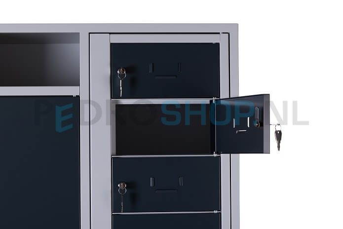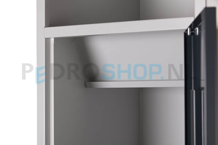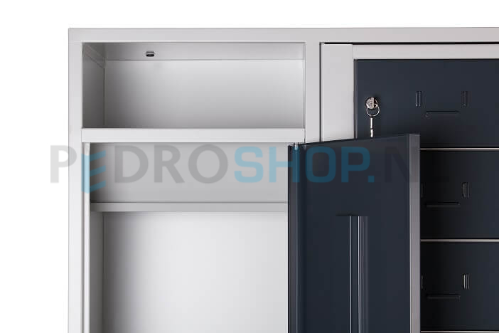 De kast is standaard voorzien van een cilinderslot inclusief twee sleutels. Dankzij de perforaties in de achter- en zijwanden kan deze kast eenvoudig rug- of zijwaarts gekoppeld worden aan andere kasten. De sokkelhoogte bedraagt 10 cm.