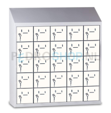 Met een afmeting van h109 x b100 x d30 cm biedt de kast voldoende ruimte voor 25 mini lockers, verdeeld over 5 kolommen met ieder 5 lockers. Elke locker heeft een afmeting van h16 x b15 x d27 cm.